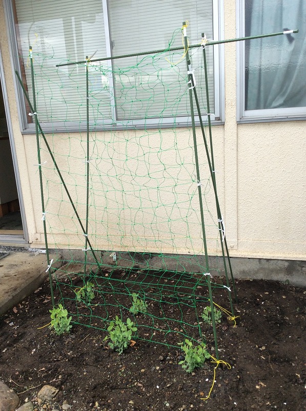なんとか、サヤエンドウの苗と網を掛けた柵を建てる事が出来ました。