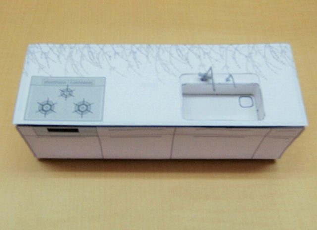 TOTO様のホームページよりペーパークラフトをダウンロードして組み立ててみましたシリーズです。今回は、システムキッチンのペーパークラフト模型です。